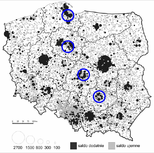 Mapa (szara) pokazuje m.in. miasta, które w szybkim tempie się wyludniają: Kielce, Tarnów, N.Sącz, Radom, Częstochowa, Bydgoszcz, Toruń itp. a jednocześnie gminy wokół nich notują wysokie dodatnie saldo.