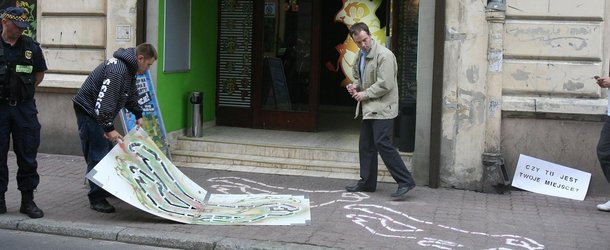 Odblaskowe obrysy sylwetek leżących ludzi pojawiły się na chodnikach przed łódzkimi sklepami z dopalaczami w nocy z niedzieli na poniedziałek. Po południu w poniedziałek kontury poprawiono na "policyjny" biały kolor i dodatkowo umieszczono obok nich ostrzegawcze napisy...