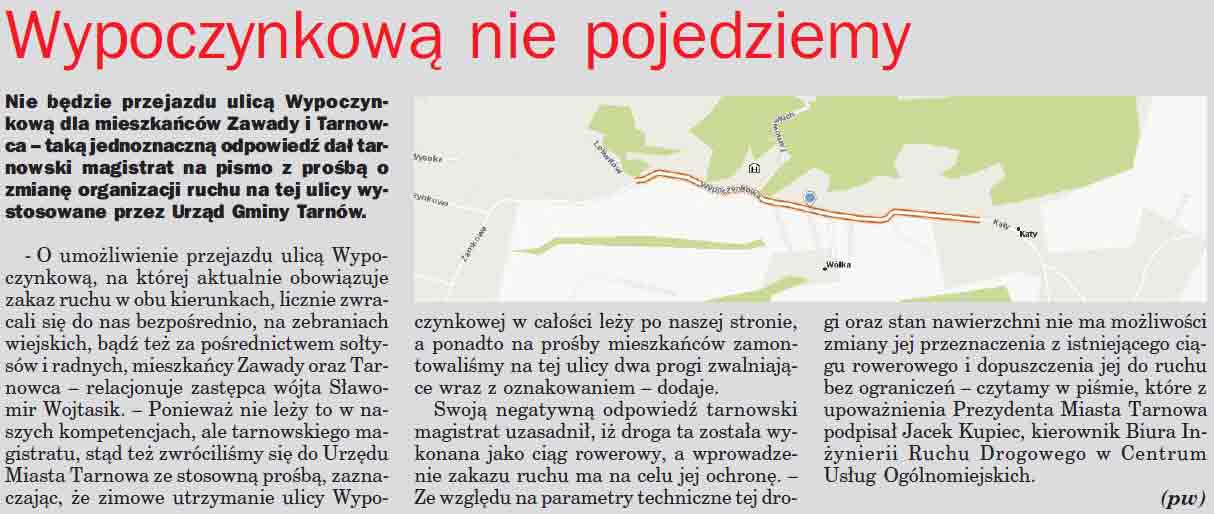 A tymczasem w gminie Tarnów wyszła nowa gazetka gminna... chyba zaczyna się wojenka. Najpierw na tapetę poszła planowana do włączenia w granice miasta Zawada. Wychodzi na to, że miasto jest be i nie interesuje się mieszkańcami Zawady. Ciekawe jakie argumenty będą użyte w Zbylitowskiej Górze? Poniżej artykuł. Pomija się istotny fakt, że droga przebiega przez teren zamku tarnowskiego i w ogóle nie powinna być nigdy wyasfaltowana a co dopiero dopuszczona do ruchu.