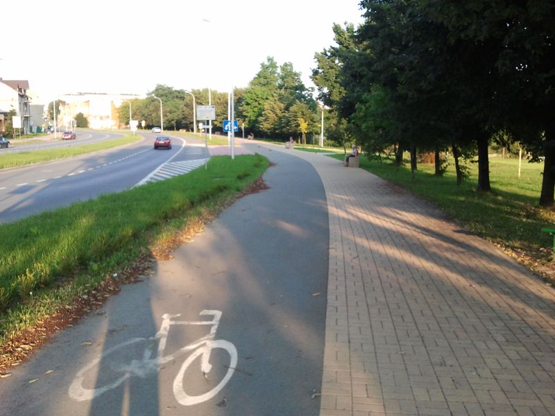 Od razu mówię - tam też są pewne uchybienia - np. między kawałkami ścieżek są fragmenty z kostki, albo ścieżka z asfaltu zaczyna się w połowie ulicy. Niemniej jest o klase lepiej niż u nas - na jednym zdjęciu widac nawet skrzyzowanie chodnika i ścieżki. Okazuje się, że ciągłość ma ścieżka - u nas na pewno byłoby odwrotnie.