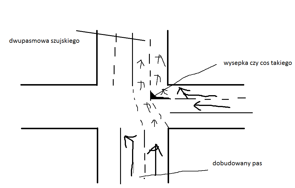 Skoro tak jest to teraz najsensowniej by było żeby lewy przed skrzyżowaniem, był tylko do jazdy w lewo a prawy do jazdy na wprost na lewym pasie Szujskiego za skrzyżowaniem, wtedy byłby i wilk syty i owca cała bo bezkolizyjny prawoskręt zostałby zachowany, najlepsza byłaby jakaś wyspeka coby ludzie nie wbijali na prawy pas wprost. Tylko ciekawe czy "dasie" to jakoś wprowadzić w życie