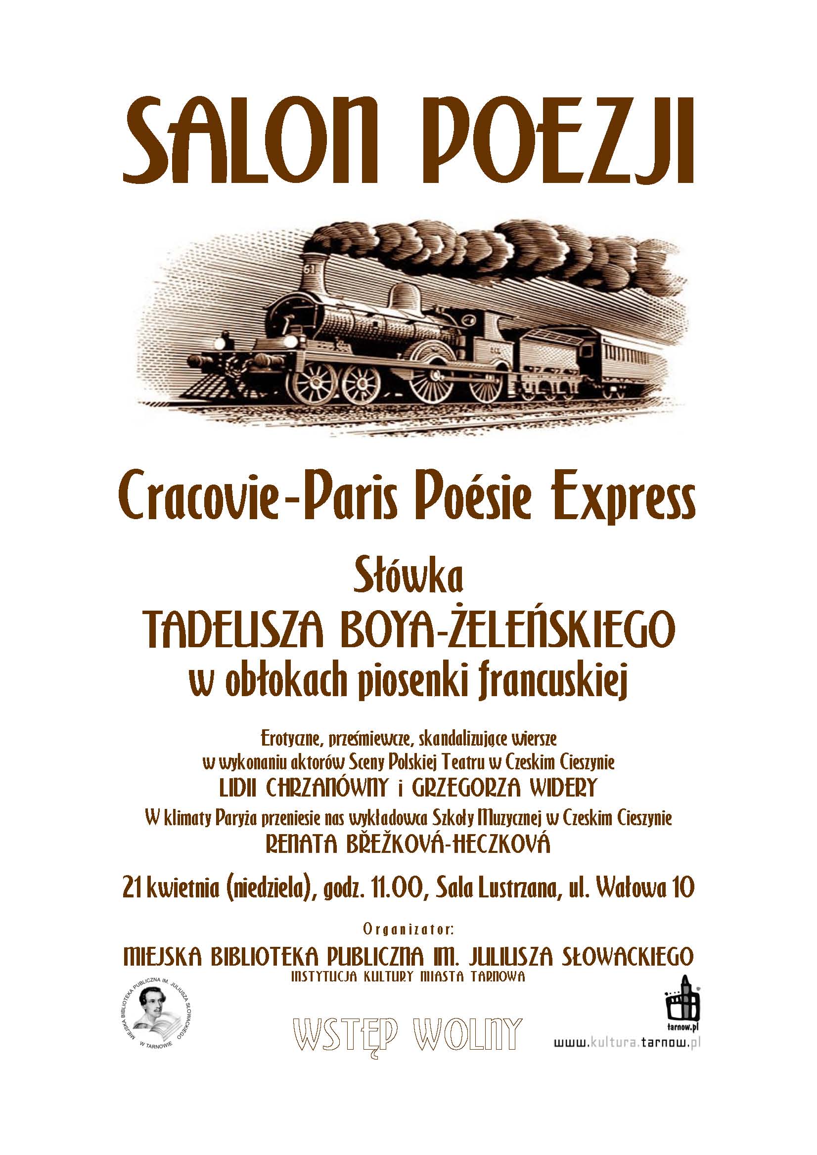 Miejska Biblioteka Publiczna zaprasza na kwietniowy Salon Poezji: "Cracovie Paris Poésie Express" - słówka Tadeusza Boya Żeleńskiego w obłokach piosenki francuskiej /21 kwiecień, godz. 11.00, Sala Lustrzana/.