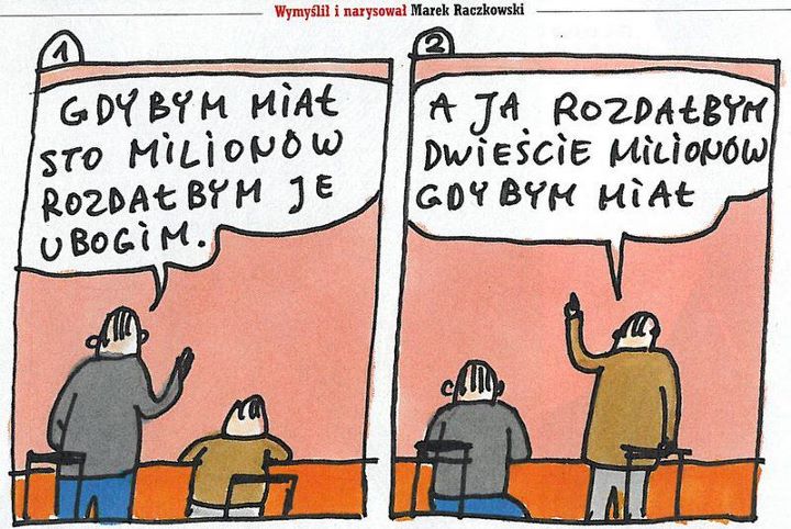 (Taki był zasłyszany w radiu komentarz do deklaracji Napieralskiego, że gdyby wygrał w totka 50 baniek to oddałby je skarbowi państwa, bo jest w potrzebie.)