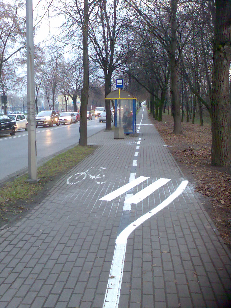 Następna sprawa, jeżeli chcemy, aby było to zrobione całkowicie jak należy, to w miejscach przecięcia się ścieżki z drogą dla pieszych wypadało by umieścić - przynajmniej poziome - znaki przejścia dla pieszych.