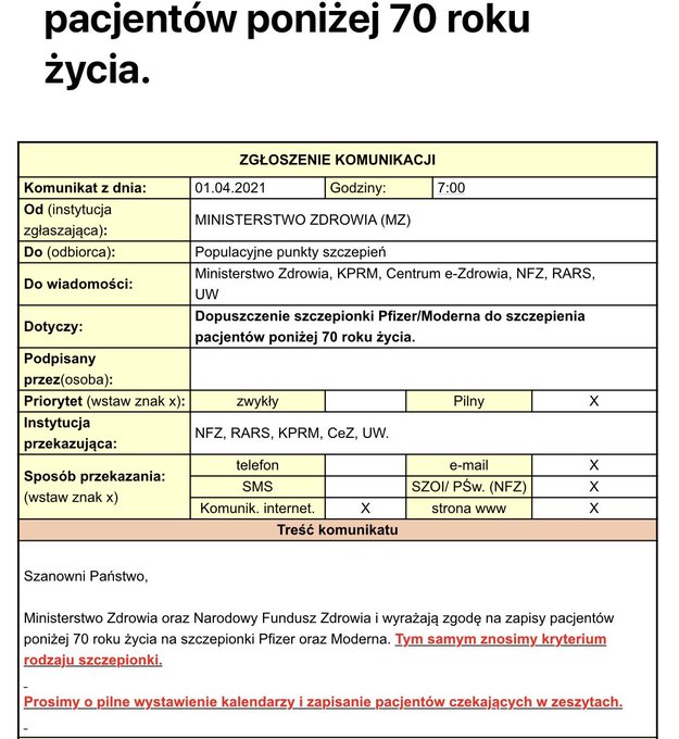 Po sieci krążą teorie spiskowe, że oni faktycznie ze względu na mniejsze niż przewidywali zainteresowanie szczepionkami, chcieli puścić młodsze roczniki (co ma sens zważywszy, że to zakłady pracy są teraz jednymi z najwięszych ognisk), ale interweniował Kaczyński który obawiał się, że starszy elektorat się wkurzy. Sam nie wiem co o tym sądzić - patrząc na to co się tam u nich wyprawia i tej teorii nie wykluczam. Część lekarzy twierdzi, że dostali informację rano o zniesieniu kryterium wiekowego na niektóre szczepionki i nawet pokazują screeny z tą wiadomością.