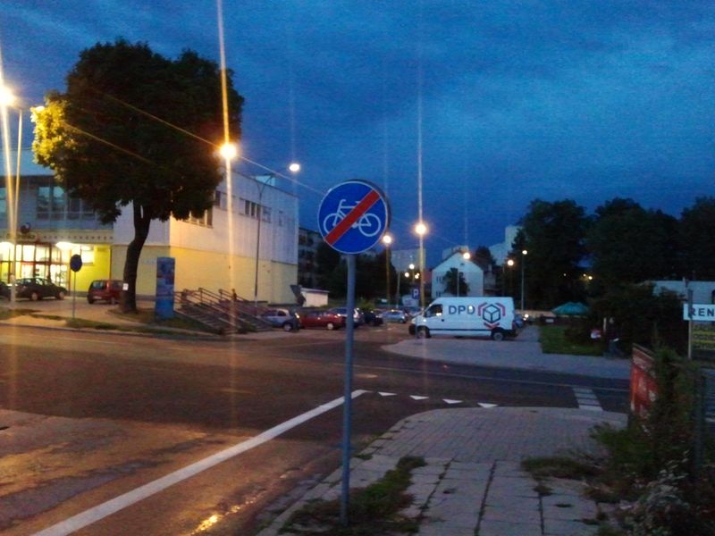 Co więcej, jeżeli jest ścieżka rowerowa, to rowerzysta powinien nią jechać. A taki znak stoi po lewej stronie. Niestety, po prawej jest znak, który wyraźnie pokazuje że ścieżka jest w kierunku do MBF, co napisał mój Poprzednik. Nadmieniam, że ścieżka jest oznaczona linią ciągłą, czyli nie można jej przejechać. Rowery są namalowane tylko w kierunku MBF. Całości dopełniają trójkąty wymalowane na całej szerokości pasa przy jego dojściu do MBF. Reasumując. Sama inicjatywa jest w porządku, wszystko jest poprawnie oznaczone poza tym wyżej wspomnianym. Jakby to powiedzieć, zawsze muszą coś skopać.