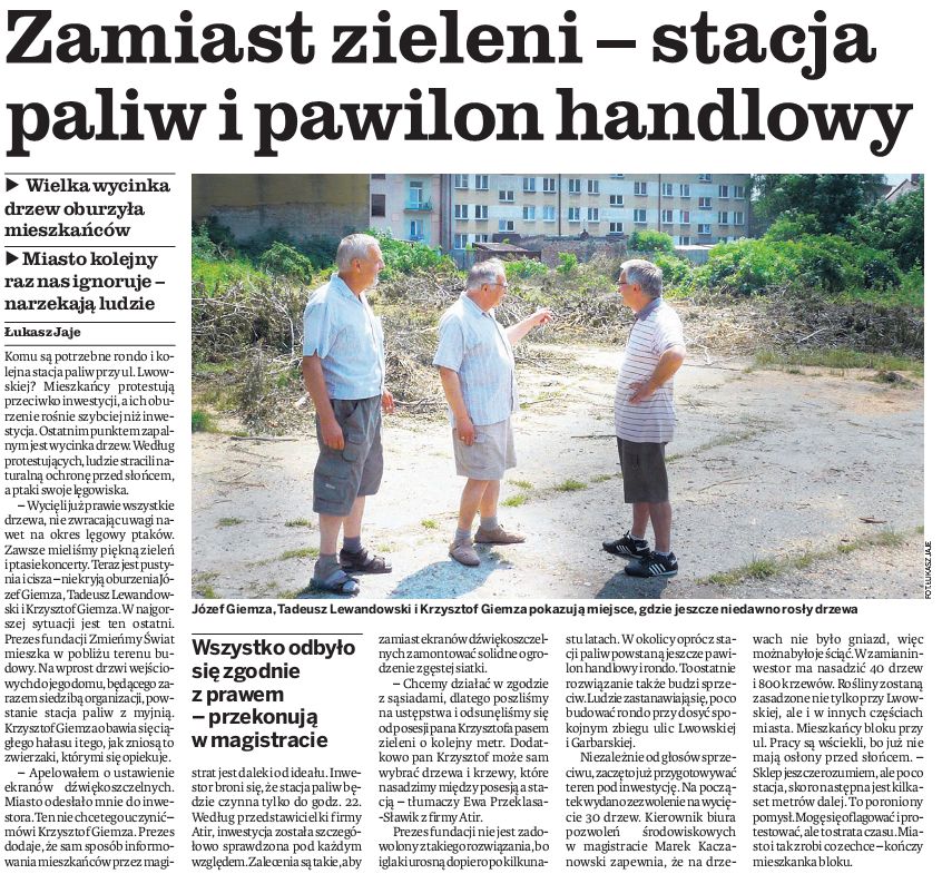 Wycięto je pod budowę stacji benzynowej Stateoil i supermarketu. Urząd miasta podobno wydał na wszystko zezwolenie. Tylko dlaczego wycięto drzewa na pasach zieleni na których nie będzie żadnych robót?????? Które niczemu nie zagrażały?