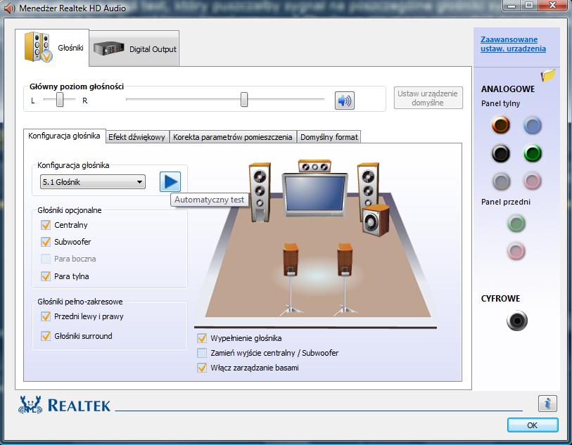 My mamy Menadżer Realtek HD Audio i tam jest możliwość sprawdzenia po kolei każdego głośnika w zestawie.