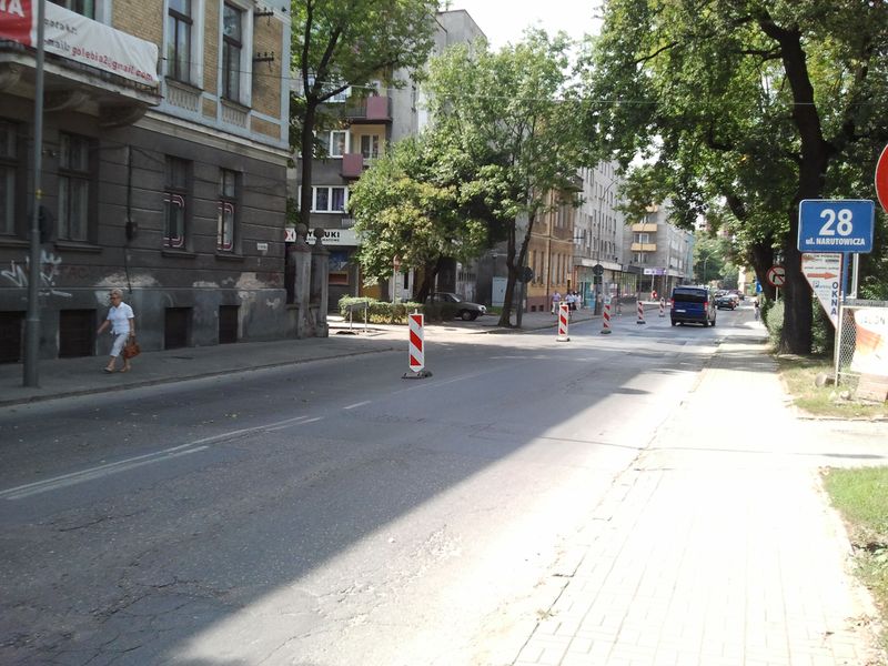 Na Narutowicza brygada w sile dwóch osób koparki i samochodu z kierowcą wywożącego stary materiał rozbierała chodnik po stronie południowej od strony ul. Limanowskiego w kierunki Wita Stwosza, sam objazd jest bardzo problematyczny dla pojazdów dłuższych typu autobusy.