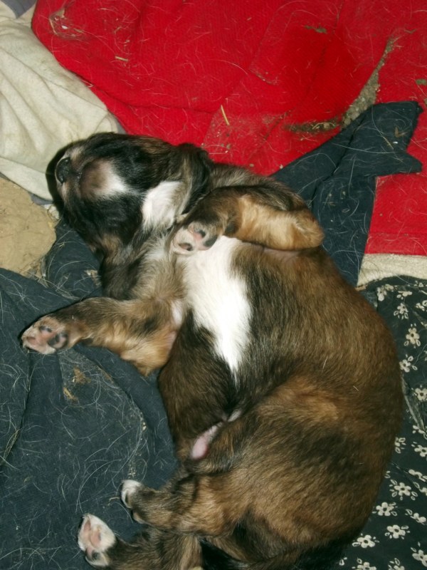 Jakis złośliwiec otworzył mi furtkę w czasie gdy moja suczka miała cieczkę. no i stało się. prawdopodobnie podbiegł ją bokser z sąsiedztwa (na co wskazuje umaszczenie i rozmiar młodych). urodziły się wcześniaki, trzy suczki zdechły ale jeden chłopiec przeżył i ma się dobrze - wypasiony za całą czwórkę.
